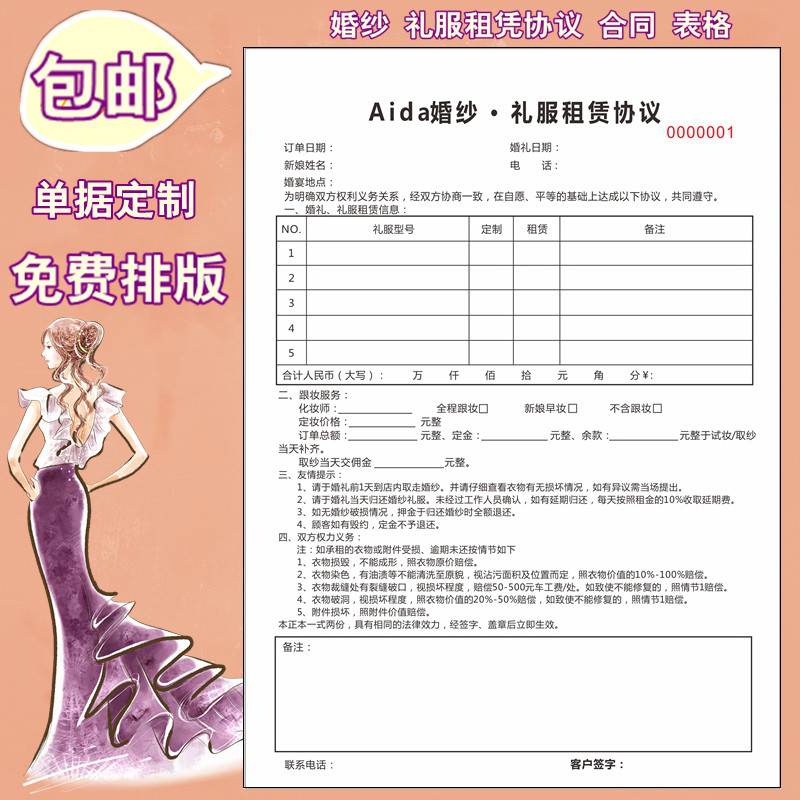 婚纱礼服馆租赁单西装礼服出租押金单摄影套系预约单无碳复写印刷热门设计联盟服务商
